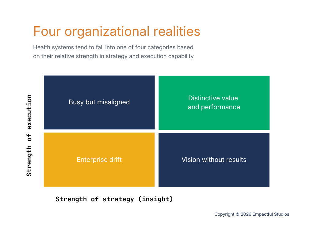 Health systems tend to fall into one of four organizational realities based on their relative strengths in strategy and execution.